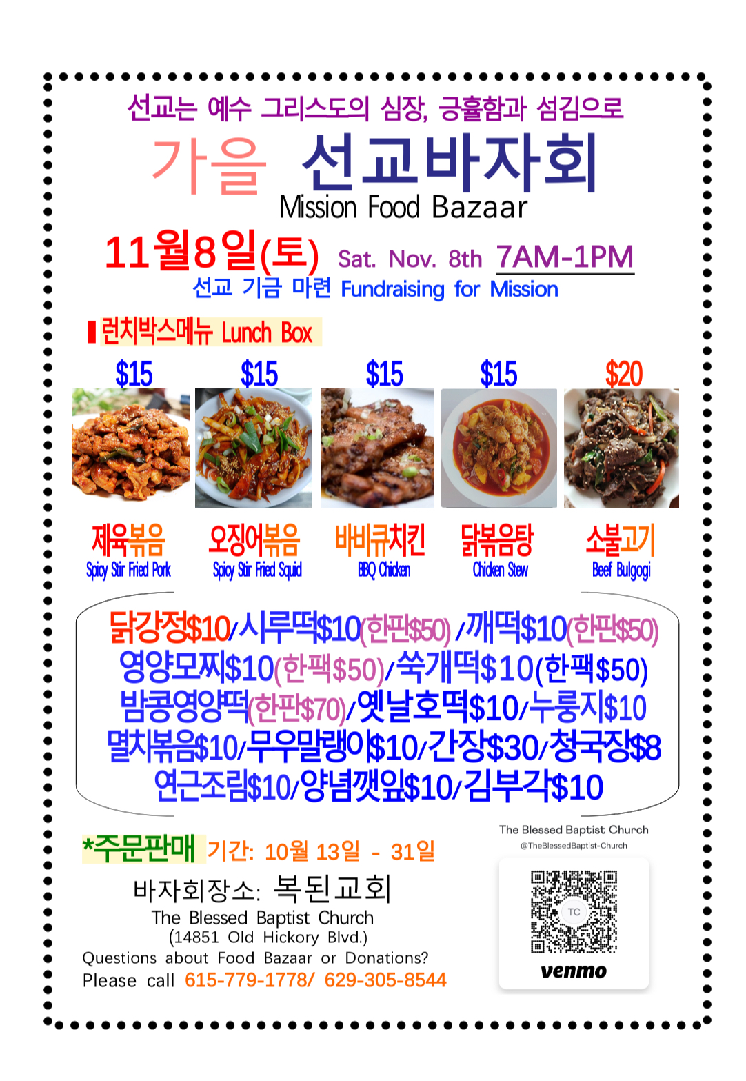 2025 가을 선교바자회(Mission Food Bazaar) 11/8 Publish on October 10,2025 | 복된교회